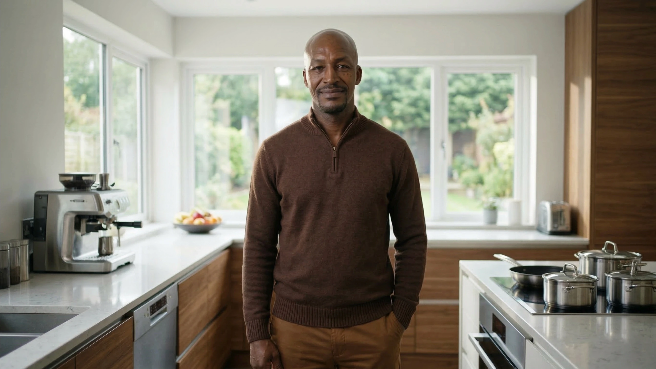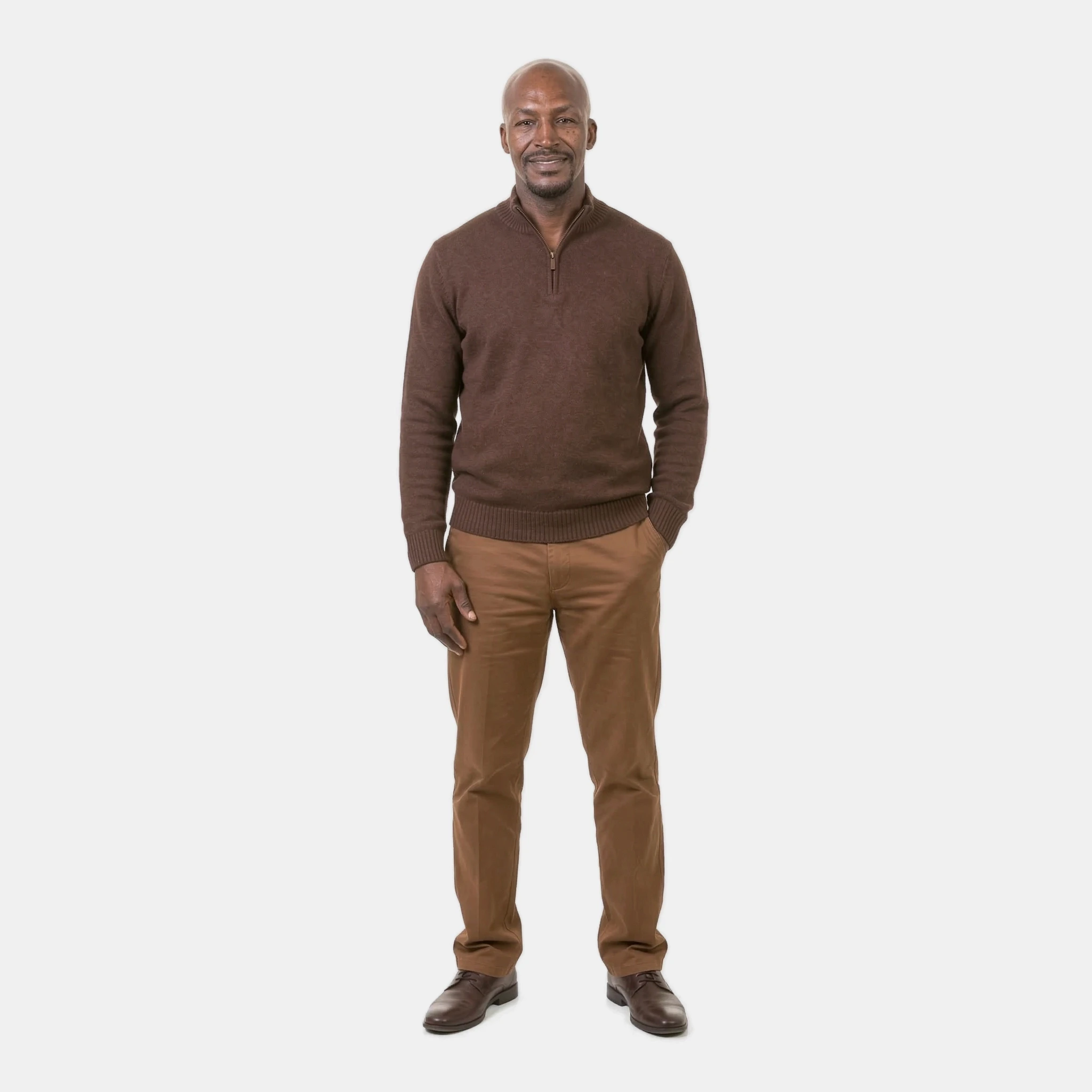 A calm and confident Black man somewhere in his late 40s with a shiny bald head and a well-maintained goatee. He is tall, well over 6 feet, with a medium build.