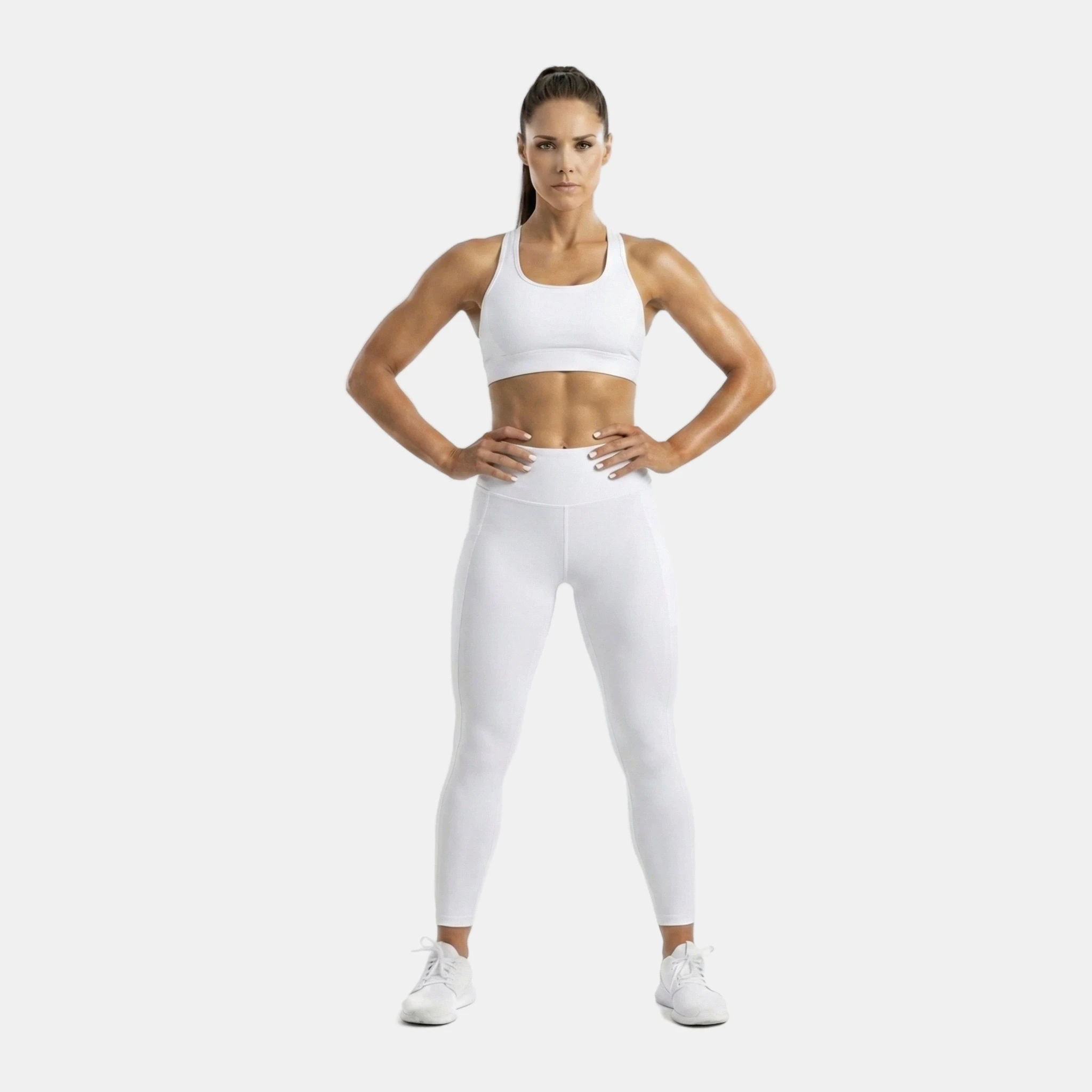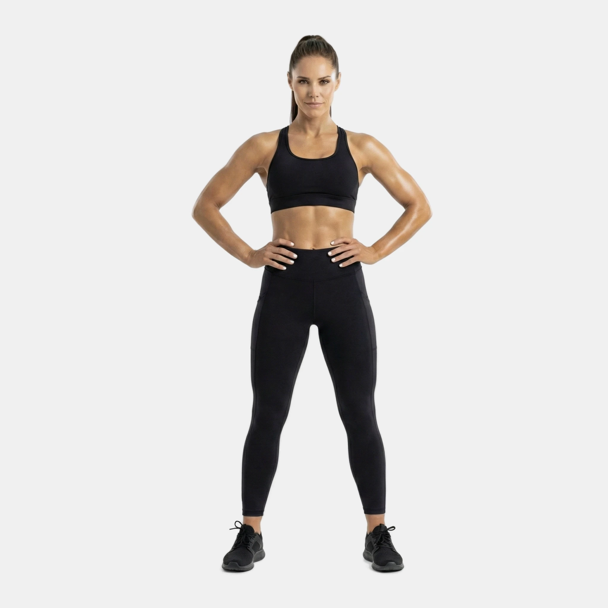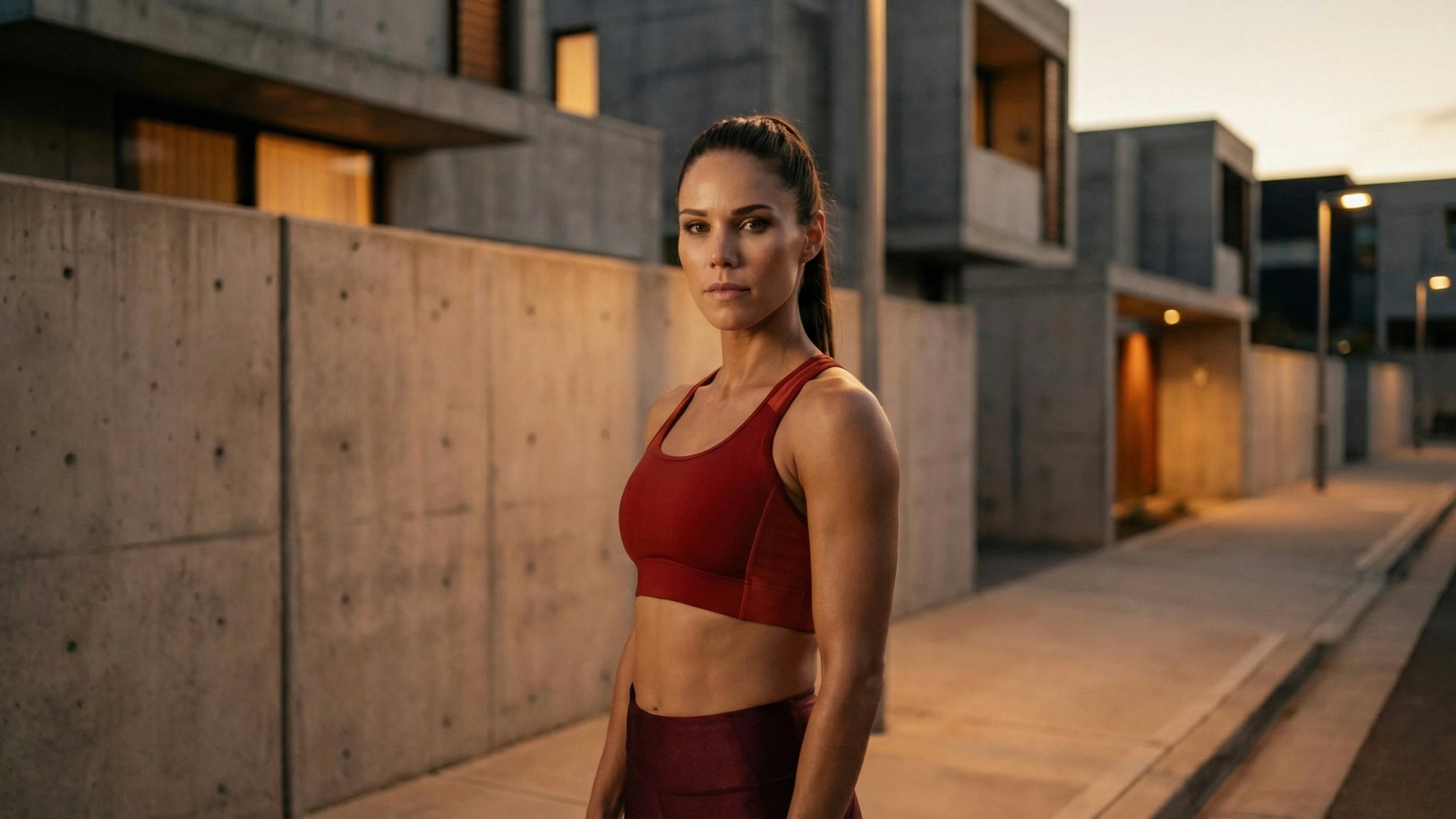A five-foot-nine, mid-thirties woman with a visibly strong female body and shoulder-length brunette hair pulled tightly into a ponytail. She sports a pert bum with small breasts and the slight swell of female hips, all wrapped in a muscular package.