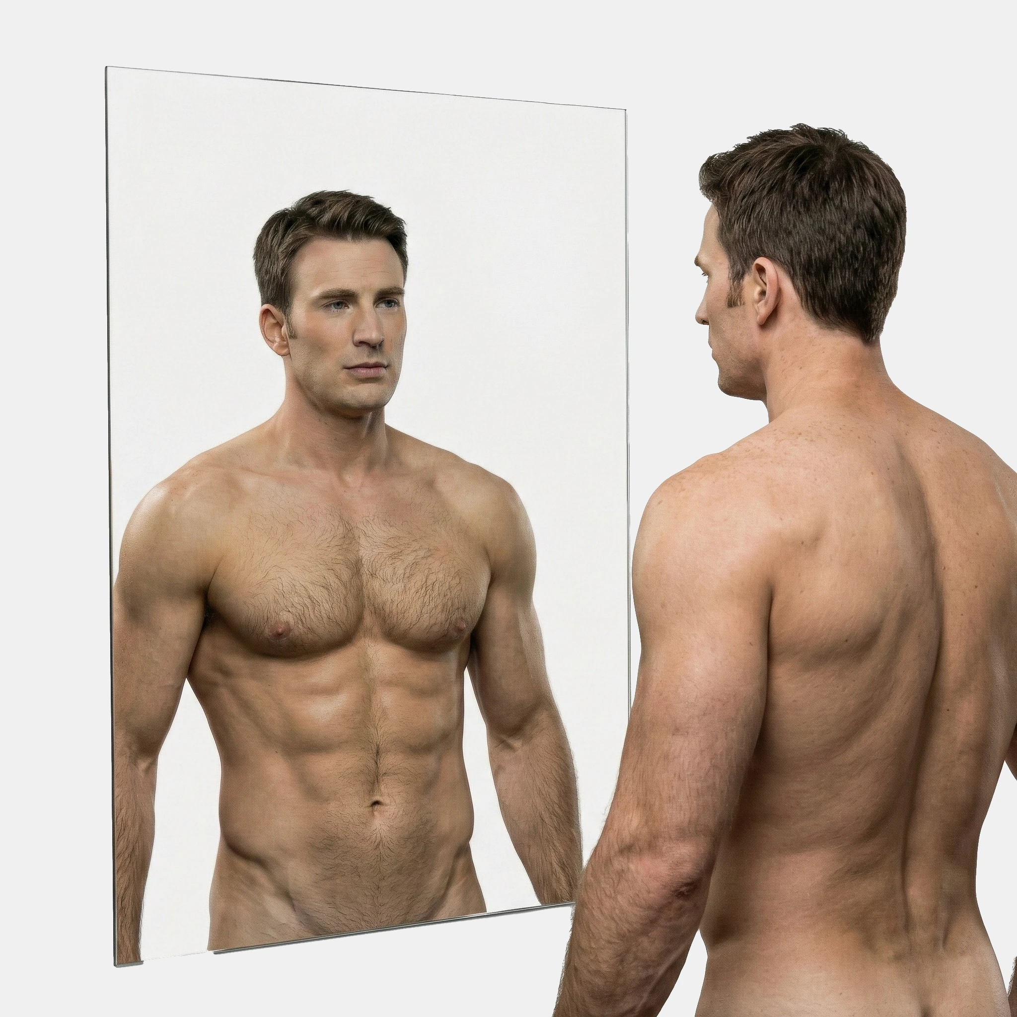 Resolved, Chris grabbed a towel and headed for the shower, stripping his sweaty clothing off in the process. He stopped and turned to see himself one last time, fully nude.