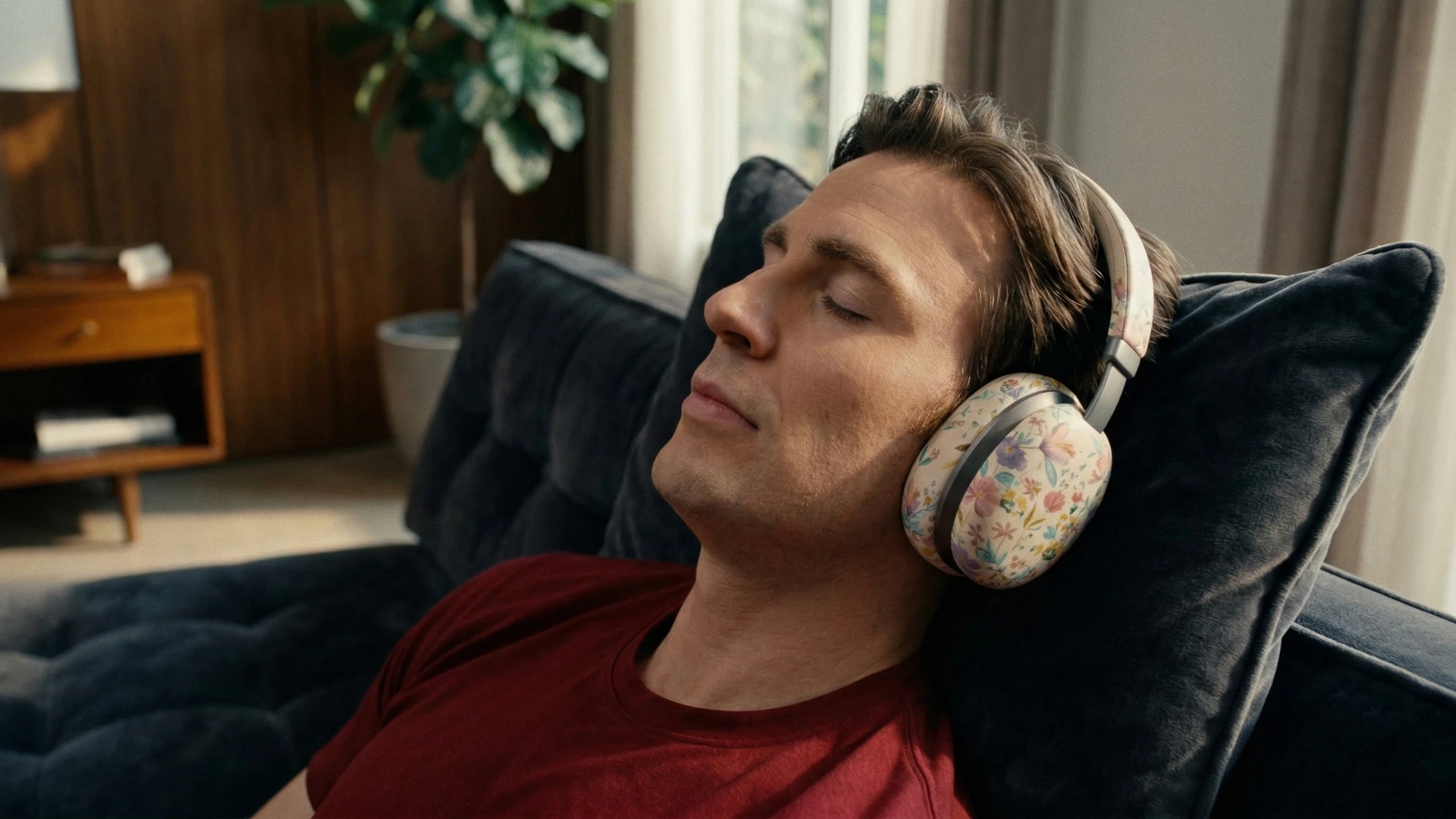 He then headed upstairs to take a shower with Miss Valentine’s strange, unknown products. The smell was still unsettling, but at least he felt clean afterwards. Chris settled onto the couch with his flower headphones. He didn’t mind wearing the headphones because it meant he got to relax. There was nary a treadmill in sight!