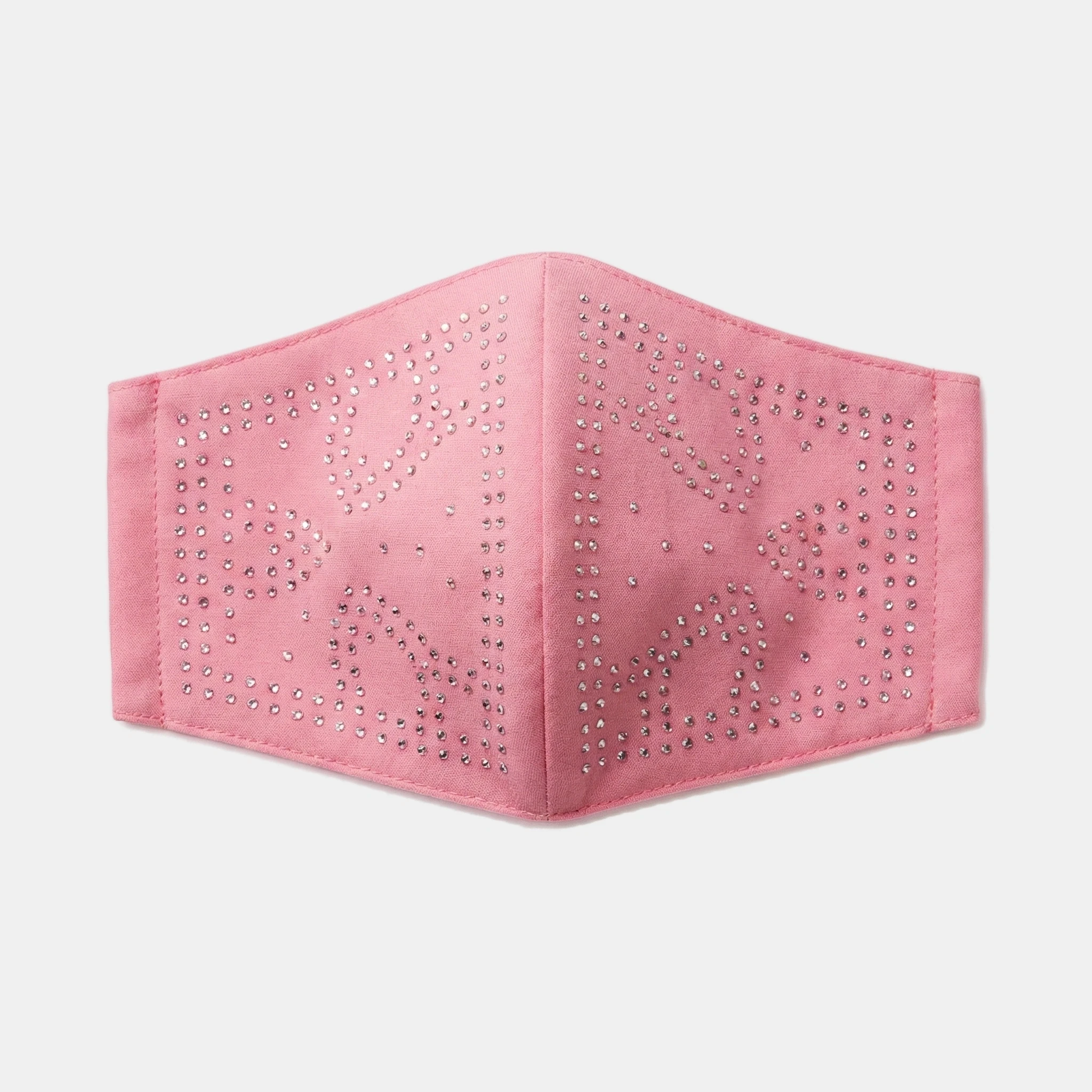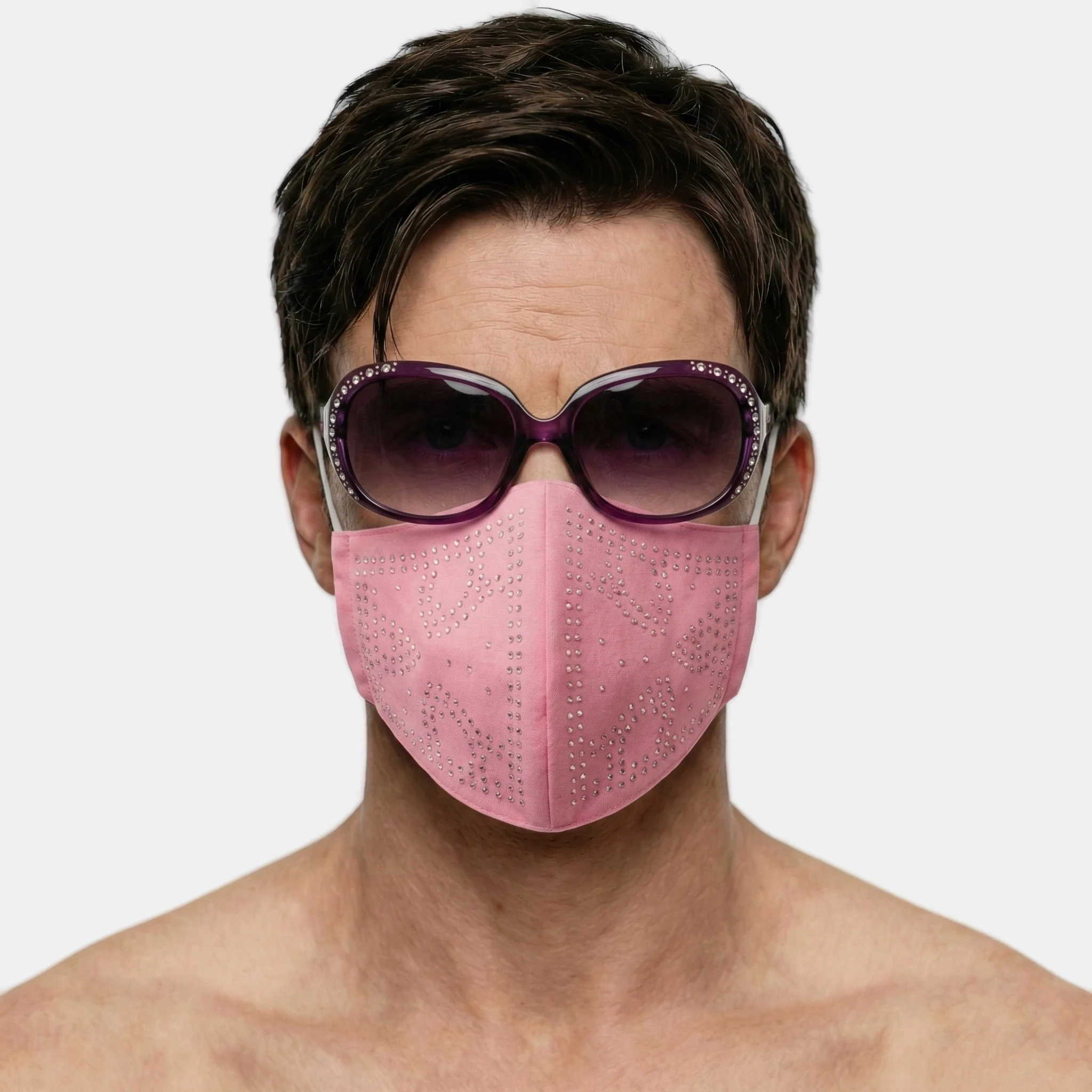 He was holding a pink face mask lined with rhinestones.
