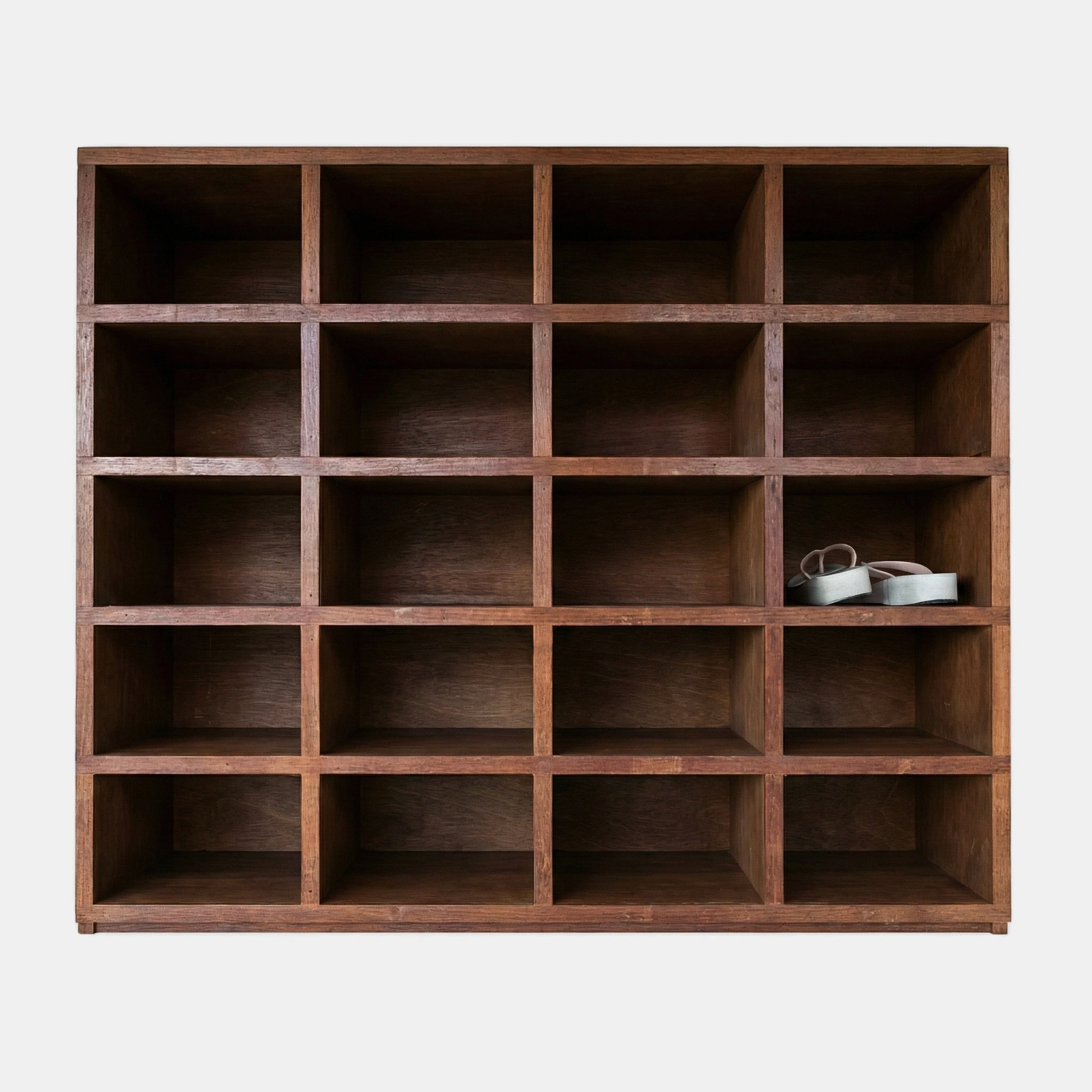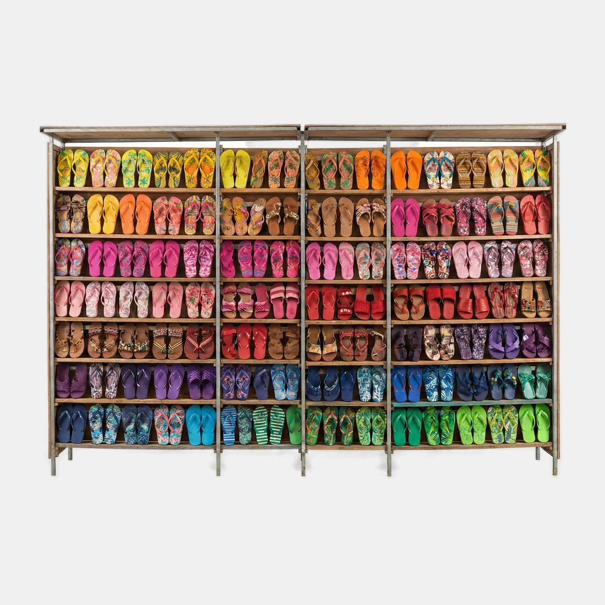 Chris turned his attention from his own shoes and saw a wall of flip-flops.