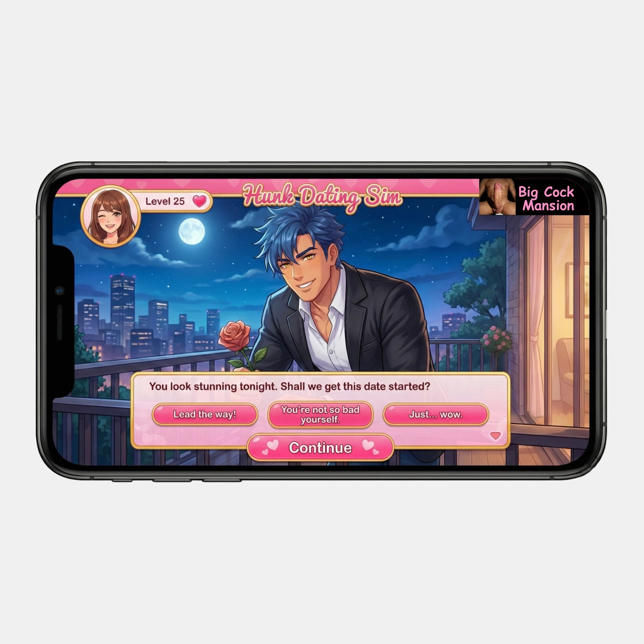 Chris slid into bed and pulled out his phone. He booted up ‘Hunk Dating Sim’ and saw a new game advertised in the corner. The picture showed a thick, veiny penis and appeared to be called ‘Big Cock Mansion.’