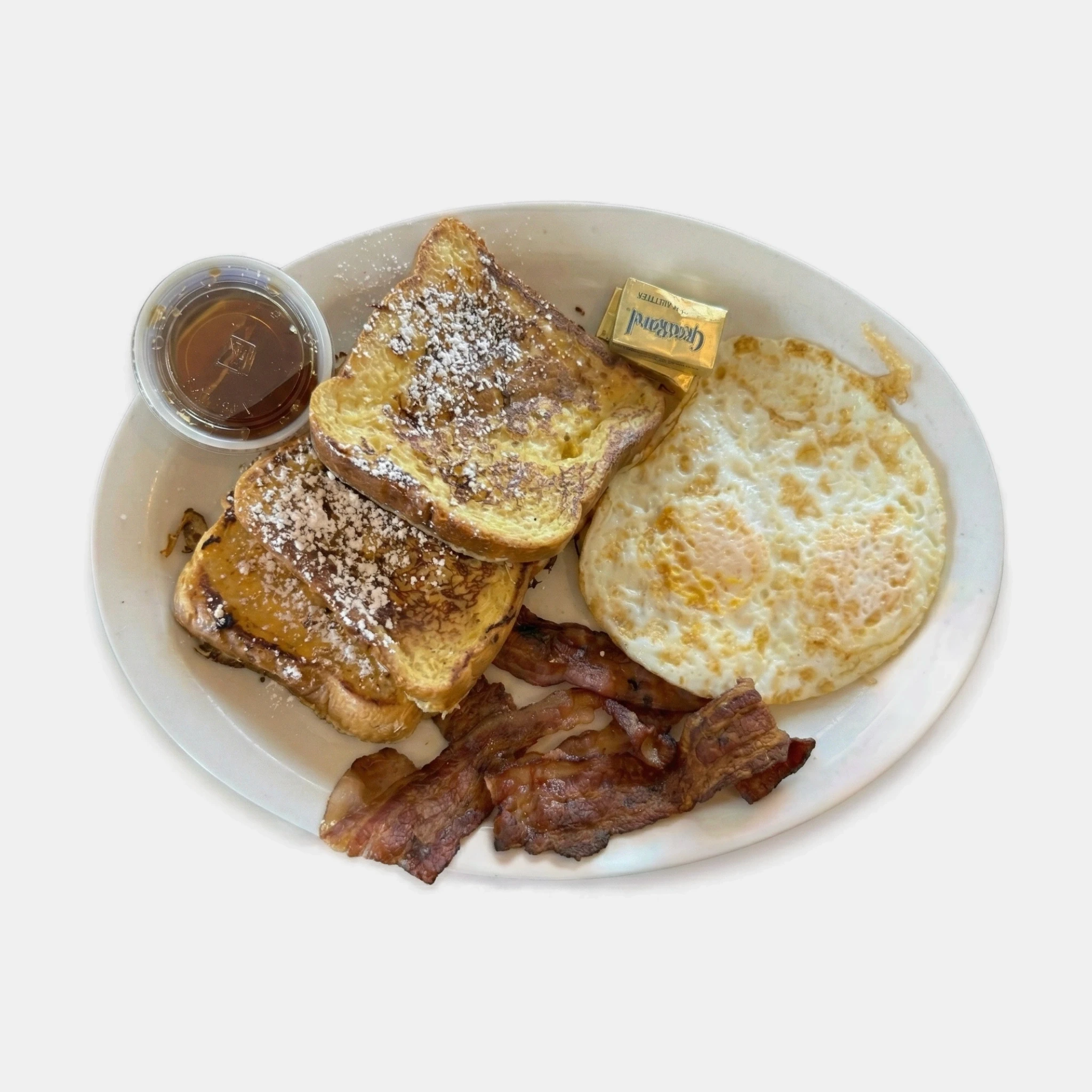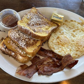 When he was satisfied, he retrieved his breakfast from the refrigerator. French toast, eggs, and bacon!