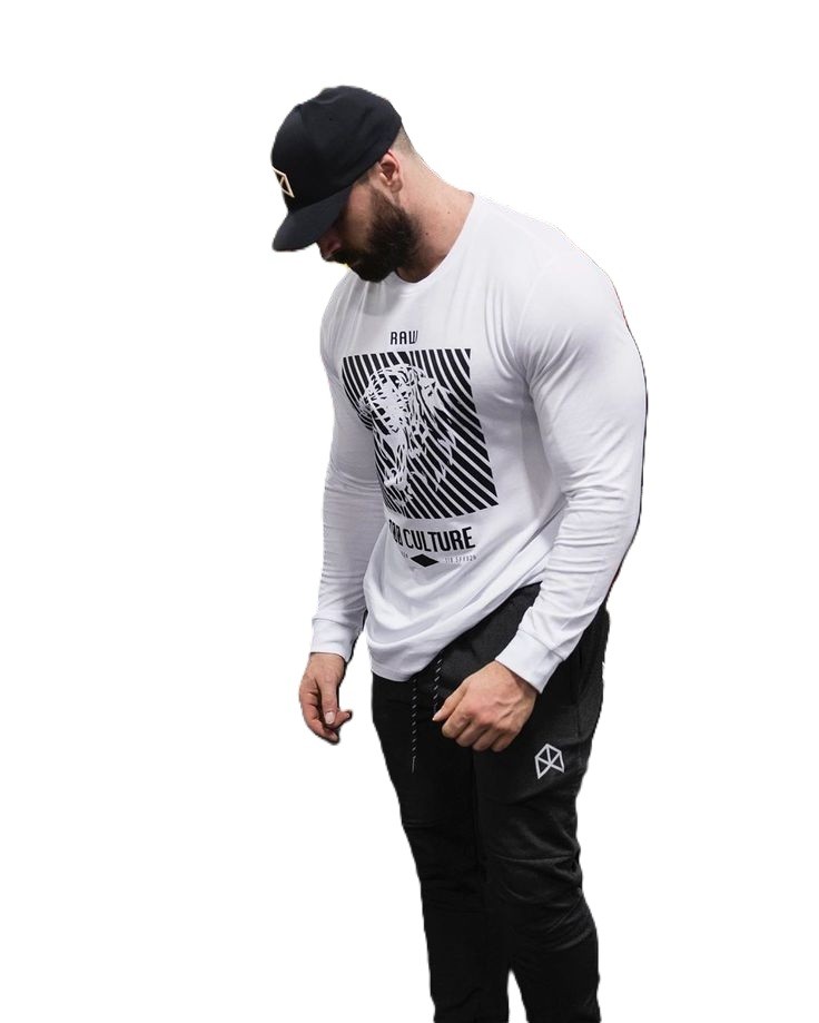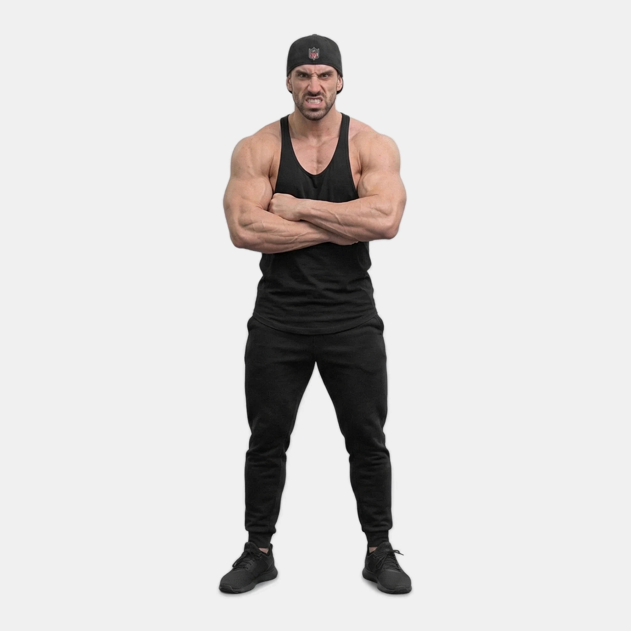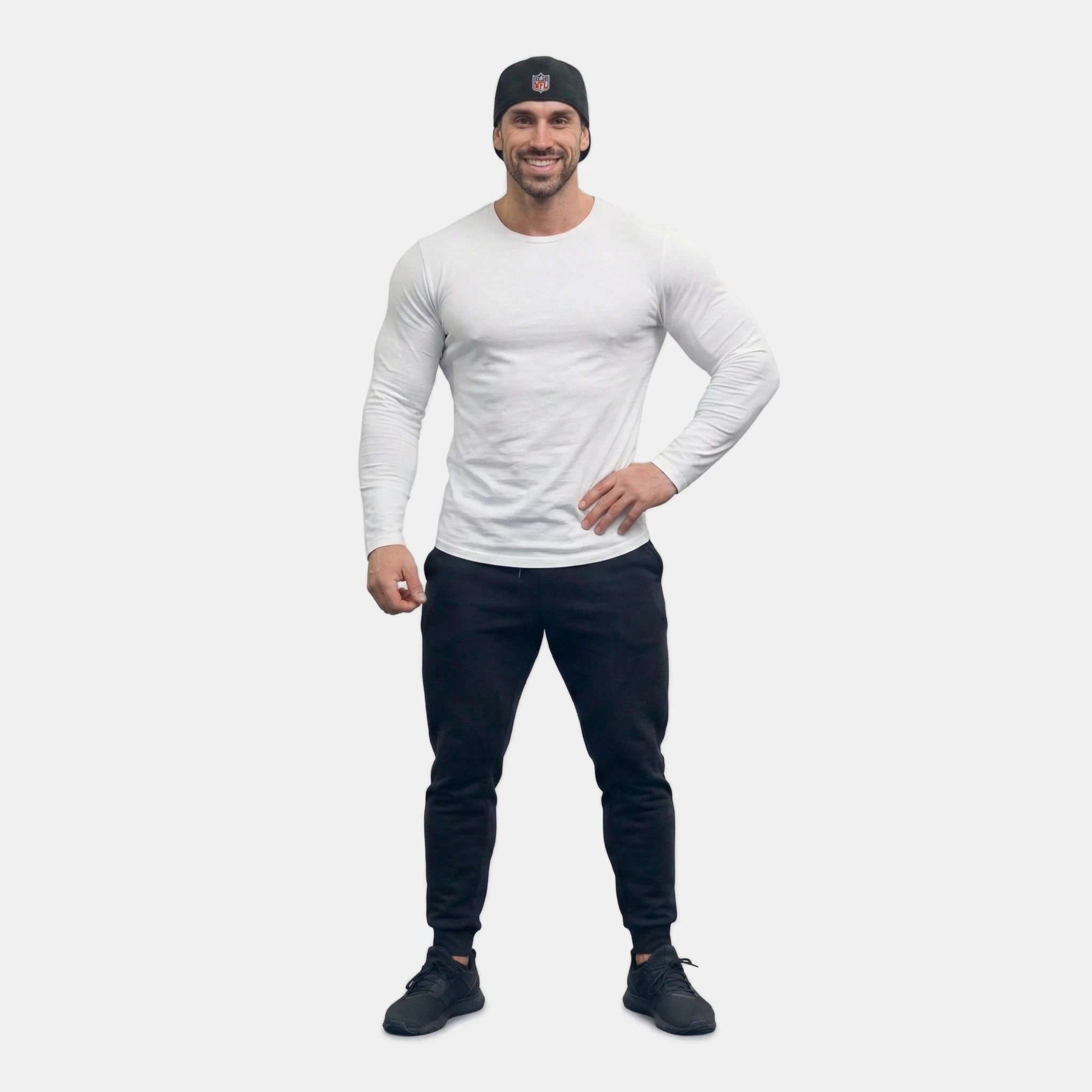 Brad wore black workout pants and a long-sleeve, white shirt with a hat. His muscles bulged against his clothing.