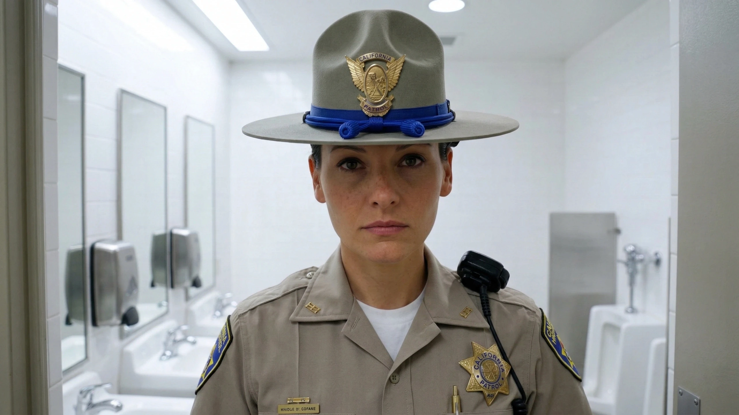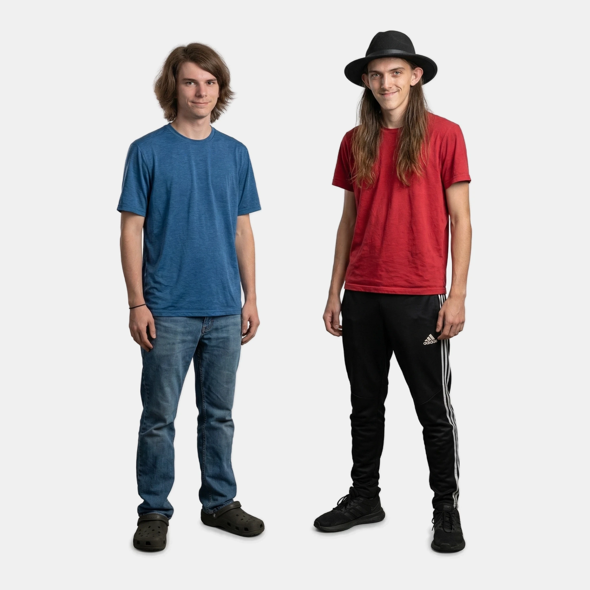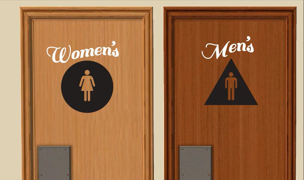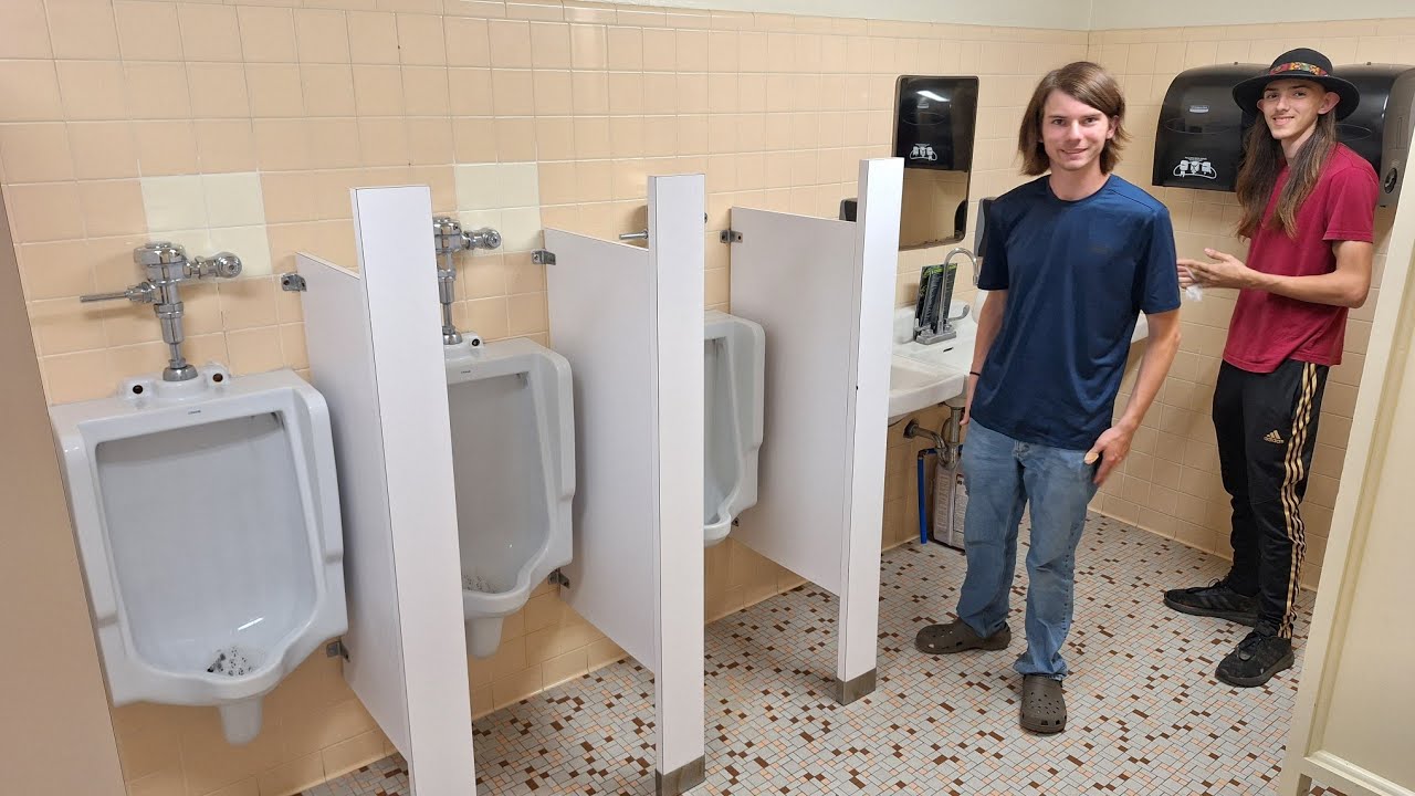 Without thinking, Chrissy plowed through the door labeled "Men’s" and entered into a tiled room with three urinals, two sinks, and one stall. There were also two young men who grinned awkwardly towards their newest bathroom companion. The first man, who appeared to be around 18, had long, greasy brown hair beneath a black brimmed hat, a red shirt, and black exercise pants. The second was similarly aged, though his brown hair was poofy and medium length, while his shirt was blue and his pants were blue jeans.