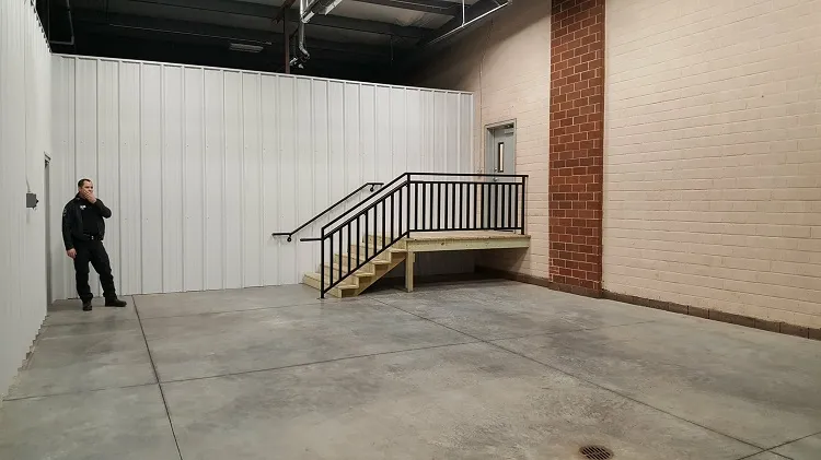 When he was done typing, Sarge nodded towards the wall where a large, white rectangle was painted on the gray concrete. A height scale was affixed to the side of the rectangle.