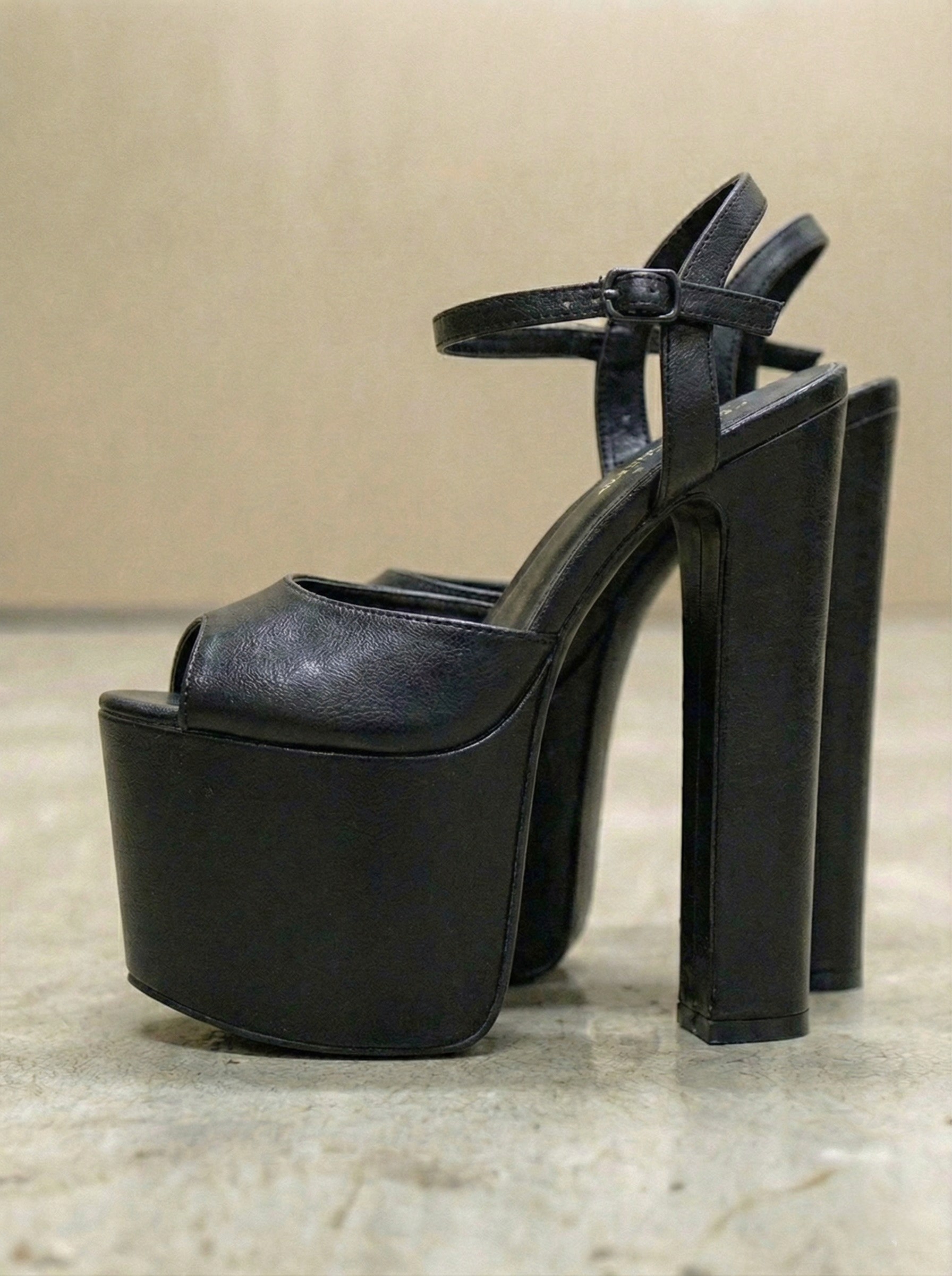 With her distraction vacated, Candy returned to the task at hand: securing her shoes. They were black leather platforms with chunky heels. The platform, combined with the curve of the shoe itself, gave Candy almost eight inches of height!