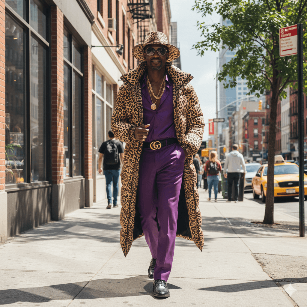 His smooth demeanor and attitude translated to his outfit, which consisted of a long, puffy, cheetah-print jacket and a matching brimmed hat. Beneath the jacket was a purple silk shirt and pants with a gold belt around his relatively narrow waist. Shiny gold chains hung around his neck, shiny black leather shoes were on his feet, and the top two buttons of the shirt were open, revealing a toned upper body and a smattering of dark hair.