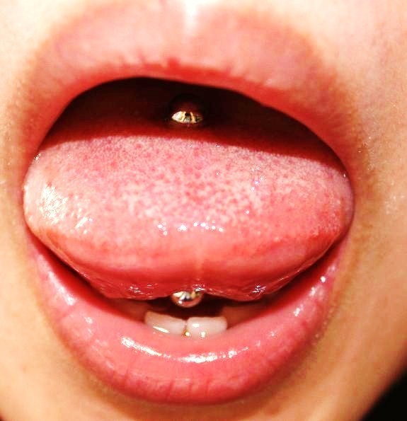 Another silver barbell clanked around her mouth.