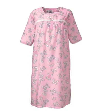 Candy swept towards the counter with an echoing *click* *click* and set her purse down while Brandon followed closely behind. He retrieved a pink hospital gown with a butterfly pattern from a nearby cabinet and placed it lightly on the bed with a papery crinkle.
